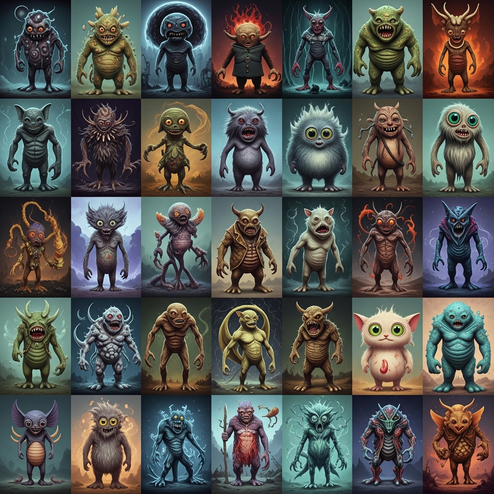 A collection of 50 highly stylized and original monster character designs, perfect for concept artists, game developers, and illustrators looking for inspiration or reference in dark fantasy, horror, or sci-fi genres.
